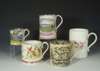 decorated with floral motifs, 14.5cm high; a transfer printed mug decorated with a giraffe and a leopard, 7.5cm high; a pink Sunderland lustre transfer printed mug commemorating 'The Cast Iron Bridge over the River Wear', with toad to well, 12.5cm high; another commemorative Sunderland lustre mug with floral motifs and inscription 'Susan Farquharson, Peace and Plenty, Glencott', 10cm high; and a black transfer printed mug entitled 'God Speed The Plough' and 'Industry Produceth Wealth', with farmyard scenes, 10.5cm high (5)