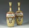each of ovoid section with a tall slender neck, decorated with floral borders and birds on a coffee coloured ground