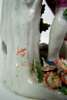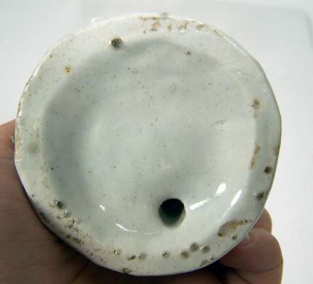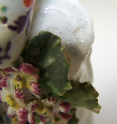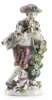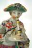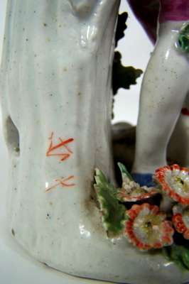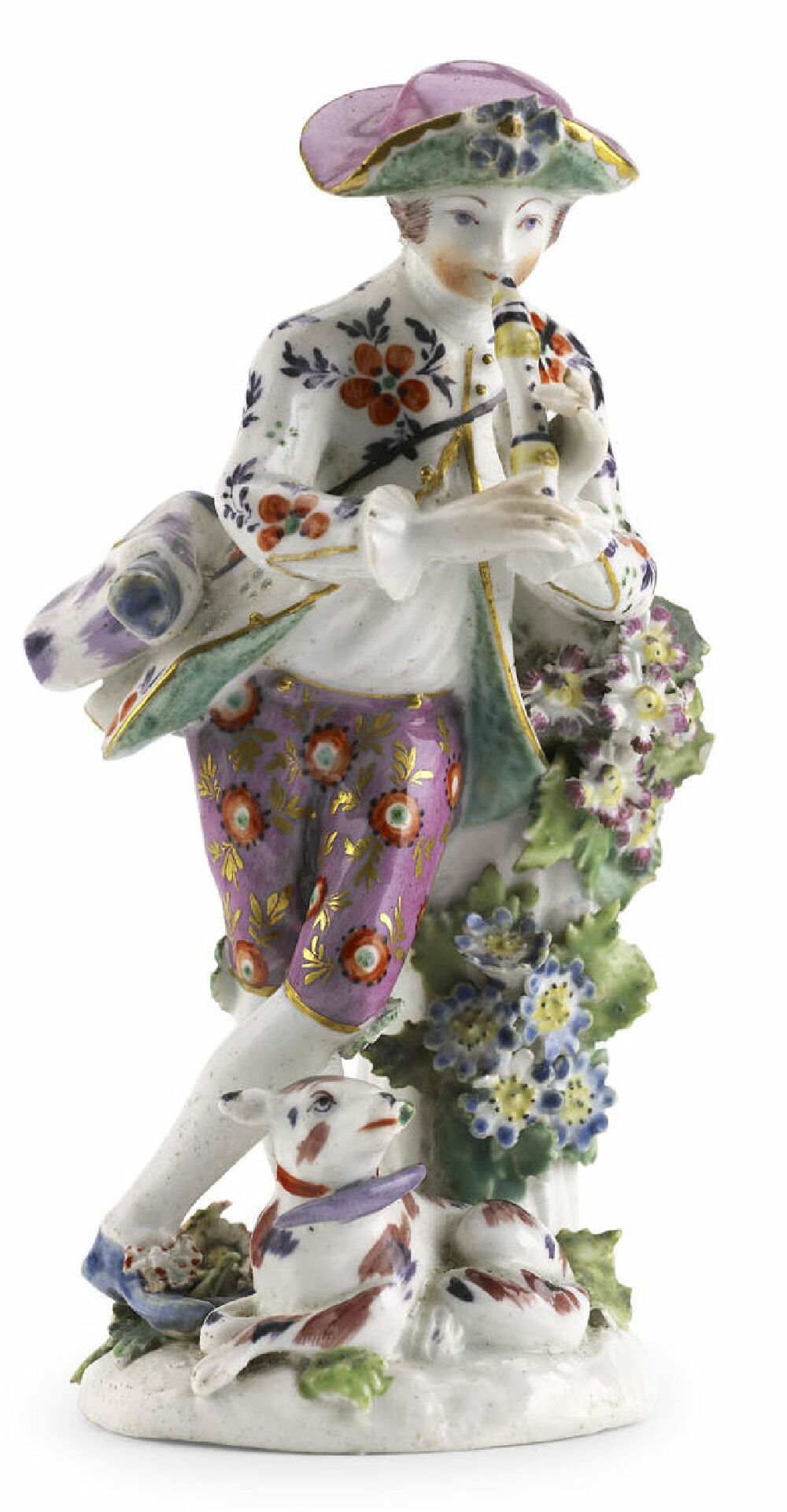 standing, leaning against a tree trunk with legs crossed, with his dog at his feet and a bag over his shoulder, wearing a pink hat and floral sprigged coat and breeches, with red painted anchor and dagger marks
