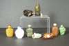 comprising: a pale green jade bottle carved in the form of a finger fungus, with matched stopper, 6cm high; A turquoise matrix oval bottle and stopper, 5.5cm high; an incised brown jade bottle decorated with water lilies, agate stopper, 6cm high; a brown mottled hardstone snuff bottle, with jadeite stopper, 6.5cm high; a brown mottled hardstone bottle, of pebble form, with later stopper, 7cm high; a mottled hardstone bottle, of pebble form, with coral stopper, 6cm high; a 19th century Chinese white agate snuff bottle with mask ring handles, lapis lazuli stopper, 6.5cm high; a mottled spinach agate snuff bottle carved with a tree and goat, pink stopper, 6cm high; and a black and green agate snuff bottle, carved with fruit and foliage, coral stalk stopper, 7.5 cm high (9)