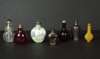 of flattened shaped form decorated with opposed landscape and flower panels, 5.5cm high; a clear glass snuff bottle of double gourd form, with tourmalinated quartz stopper, 8cm high; an iron monochrome porcelain snuff bottle with narrow cylindrical neck (no stopper), old paper label 'Iron rust porcelain, Chien Lung', 7cm high; an 18th century monochrome porcelain snuff bottle of slight baluster form, black glazed, 7cm high; a Canton enamel snuff bottle decorated with opposed figures in landscape, with hardstone inlaid metal stopper (damages), 8cm high; a plain red glass snuff bottle, pink hardstone stopper, 7cm high; and a small mustard glass snuff bottle, amber and malachite stopper, 6.5cm high (7)
