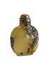 of flattened ovoid form, carved with brown and black inclusions, with figures and animals amidst pine trees, with amber stopper