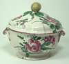 of shaped circular form with handles, the cover with fruit shaped finial, decorated allover with roses