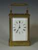 with white enamel dial and black roman numerals, the lever escapement striking on a gong, in a brass case with outer leather fitted case