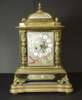the silvered dial painted with birds and flowers with arabic numeral chapters, the cylinder movement striking on a gong, the case with domed top surmounted by acorn finials, the dial flanked by sphinx shaped caryatids over a stepped base and giltwood platform
