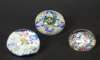 of scrambled design, 6cm wide; a dated Perthshire paperweight, dated 1973, scattered millefiori on tossed muslin, label to base, 7cm wide; and a French paperweight, interlaced quatrefoil design on tossed muslin, 7.5cm wide (3)