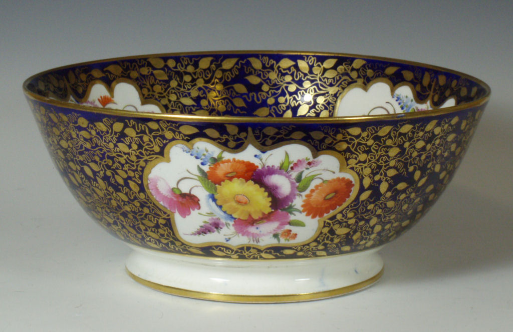 decorated with polychrome flowers on a cobalt blue ground with gilt highlights, 31cm wide; and two oval dishes with similar decoration, each 28.5cm wide (3)