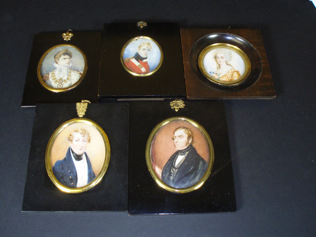 each in an ebonized and gilt frame, comprising: a miniature of Napoleon in ceremonial dress wearing a laurel crown, 7cm x 6cm; a miniature of an army officer, 6.5cm x 5cm; a miniature of a lady with a bouqet of flowers, 5.5cm x 5.5cm; a miniature of a young gentleman, 8cm x 6.5cm; and another miniature of a young gentleman, 8.5cm x 7cm (5)