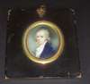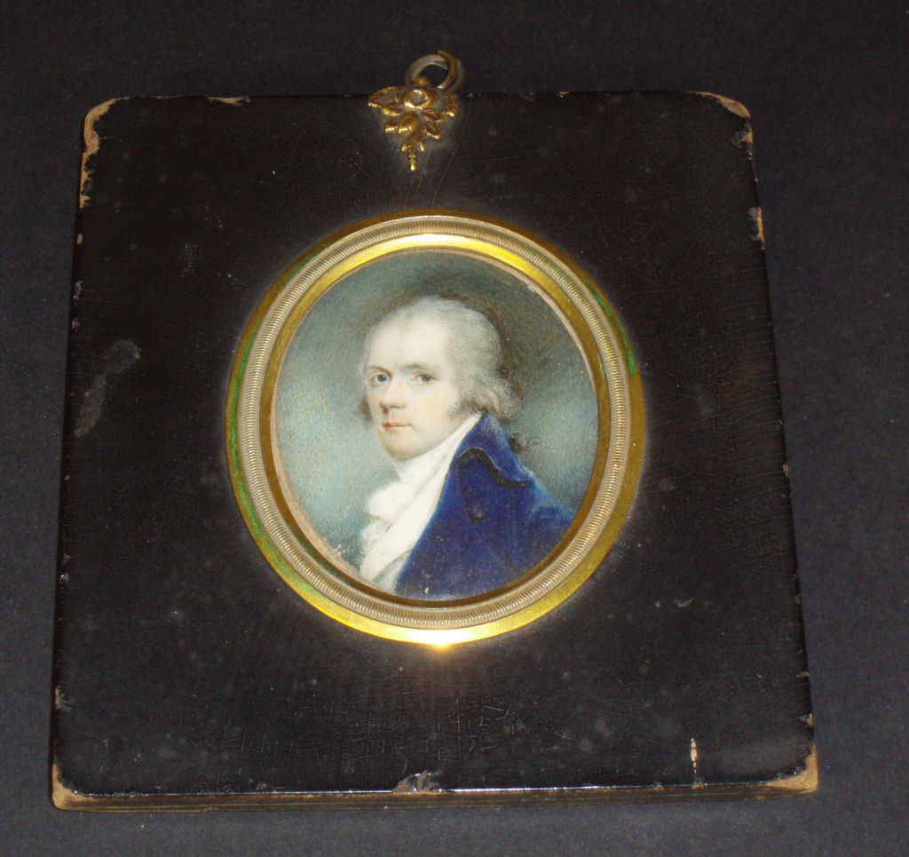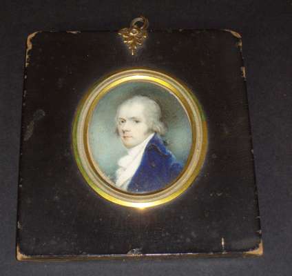 wearing a blue coat, in a gilt and ebonized frame, the verso with indistinct inscription