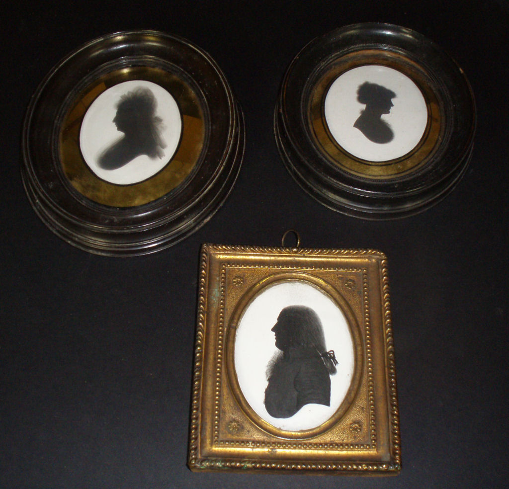 painted on plaster, in a verre eglomise and ebonized frame, trade label to verso, 8.5cm x 7cm; an oval portrait silhouette of a lady, by George Bruce, painted on plaster in a verre eglomise and ebonized frame, signed 'Geo. Bruce' to verso, 9cm x 7cm; and a portrait silhouette, painted on plaster, in a gilt metal frame, the inscription to verso 'Capt. D. Macdonald's father', 8.5cm x 6.5cm (3)