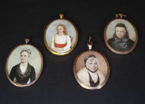 each of oval form, comprising: a miniature of an old lady, with hair design to verso, the copper frame engraved 'J. McDonald taken 1805 aged 78', 7cm x 5.5cm; another miniature of an old lady dressed in black, 7cm x 5.5cm; a miniature of a lady, signed 'W.B. 1889' with hair design to verso, 7.5cm x 6cm; and a miniature of a girl, signed 'W.B. 1889', 7.5cm x 5.5cm (4)