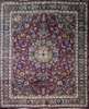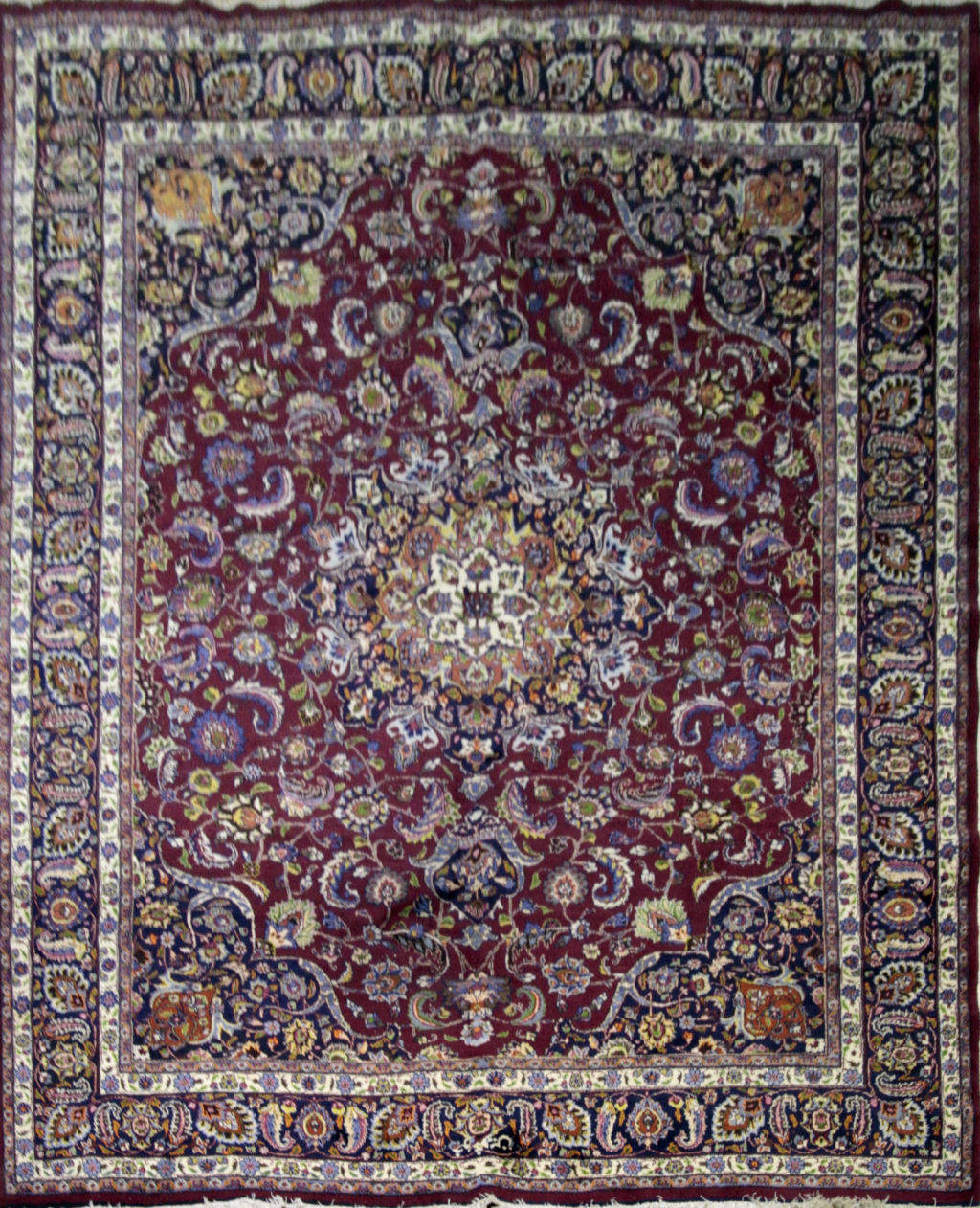 late 20th century, the red field with central ivory brown and indigo medallion, similar spandrels, within indigo palmette and foliate vine border between cream bands