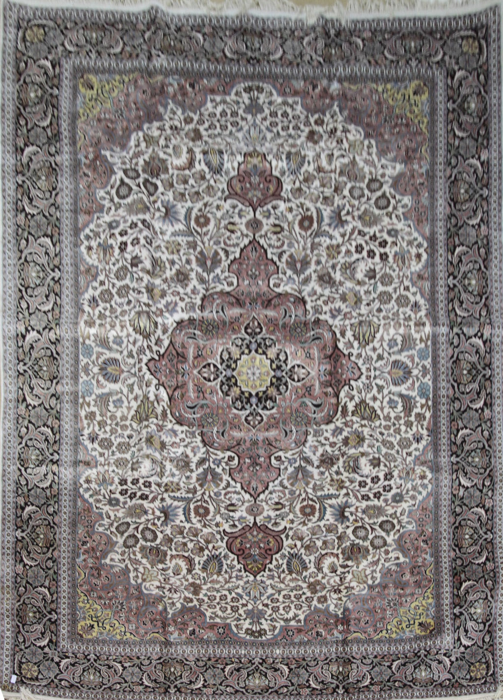 modern, the ivory field with central brick red cusped medallion suspending pendants, similar spandrels, within dark brown palmette, rosette and arabesque scrolling vine border between bands