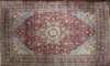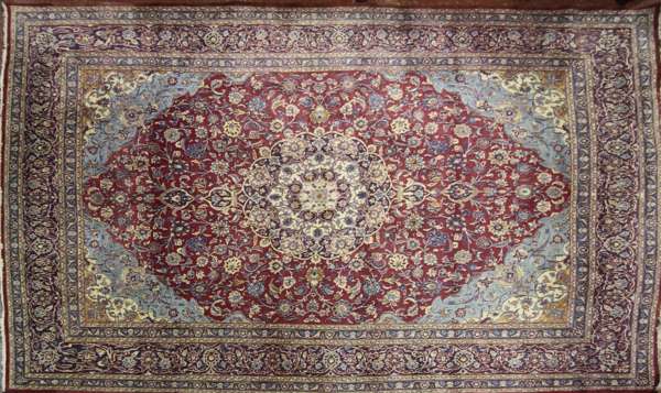 late 20th century, the red field with central indigo and ivory medallion, light blue and ivory spandrels, within indigo palmette and arabesque vine border between blue bands