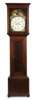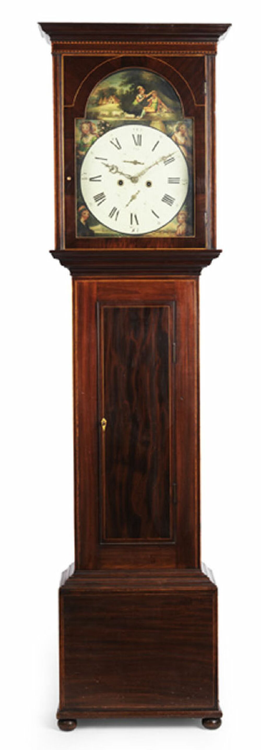 the 12 inch painted arch dial with subsidiary seconds dial, date dial and twin winding apertures, the corners painted with ladies symbolizing the seasons and the upper arch with a country scene, the eight day twin train movement striking on a bell, the case inlaid with plain and chevron stringing