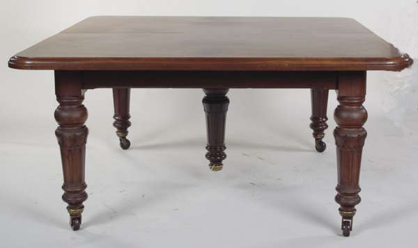 the moulded rounded rectangular top, raised on fluted baluster turned legs terminating in ceramic castors, including three additional leaves,154cm deep, 76cm high,313cm; and a buffet leaf holder, the moulded rectangular top over panelled front flanked by scroll brackets, enclosing space for six leaves, raised on a plinth base, 167cm wide 76cm high, 69cm deep (2)
