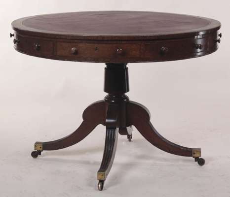 the circular top with skiver over frieze drawers, one containing a writing slope, raised on baluster turned column with quadruped reeded sabre legs terminating in brass caps and castors