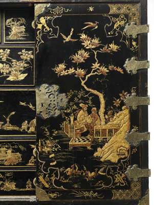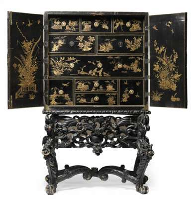 the sides decorated with flowering vases and birds, the pair of doors decorated with figures and buildings and birds in a waterside landscape, with scroll and foliate chased brass hinges, mounts and large escutcheon, the interior with foliate and foliage sprays to the rear of the doors and enclosing an arrangement of ten drawers individually decorated with figures, birds and landscapes, the later black painted ornate foliate scroll form stand centred by a pair of putti upholding a garland