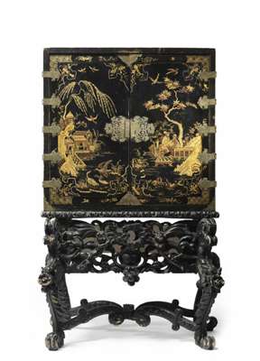 A George III black japanned and Chinoiserie cabinet on stand