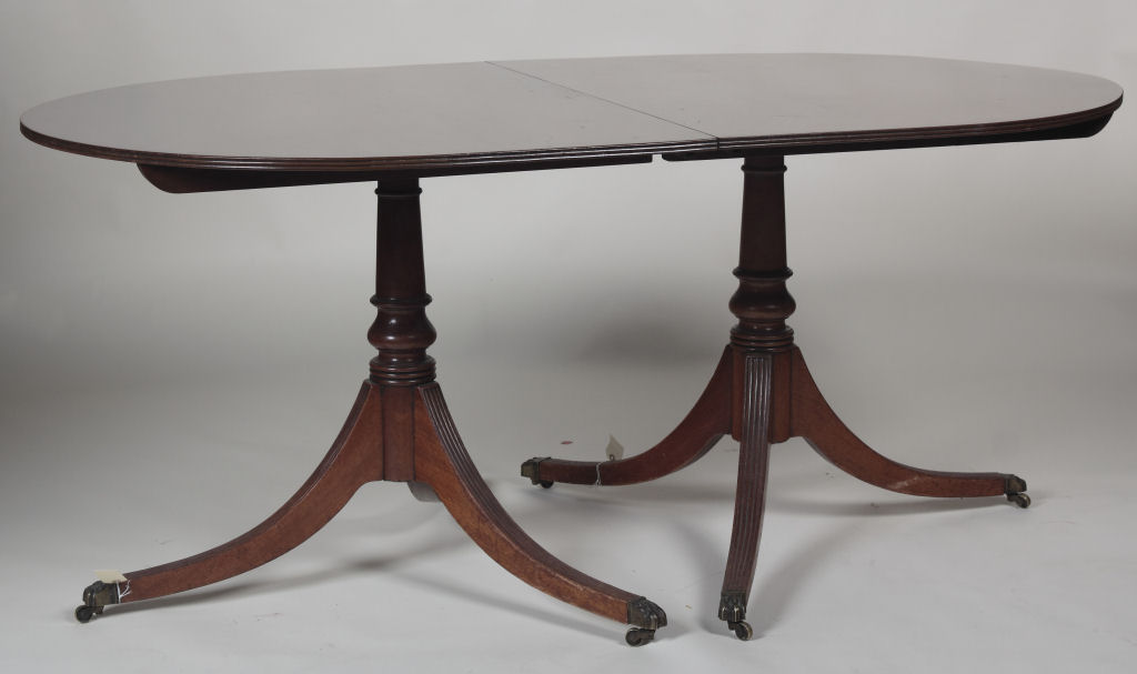 the readed D-end top raised on baluster turned column, reeded sabre tripod legs terminating in brass caps and castors; including an additional leaf