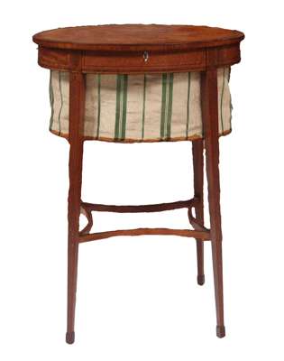 A Sheraton period satinwood, tulipwood crossbanded and line inlaid oval work table