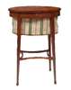 the inlaid frieze above a fabric lined wool well, on slender square tapering legs, headed by oval partridge-wood veneered paterae, ending in block feet, united by inswept perimeter stretchers