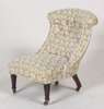 the scroll top button-back over a serpentine seat raised on tapering turned legs terminating in ceramic castors