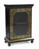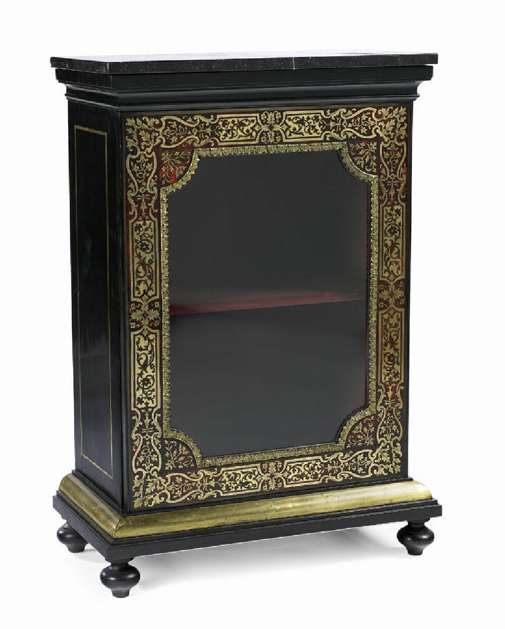 the rectangular black marble top above a moulded cornice and glazed panel door enclosing a lined interior with central shelf, on a brass cushion moulded plinth base with bun feet