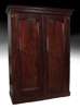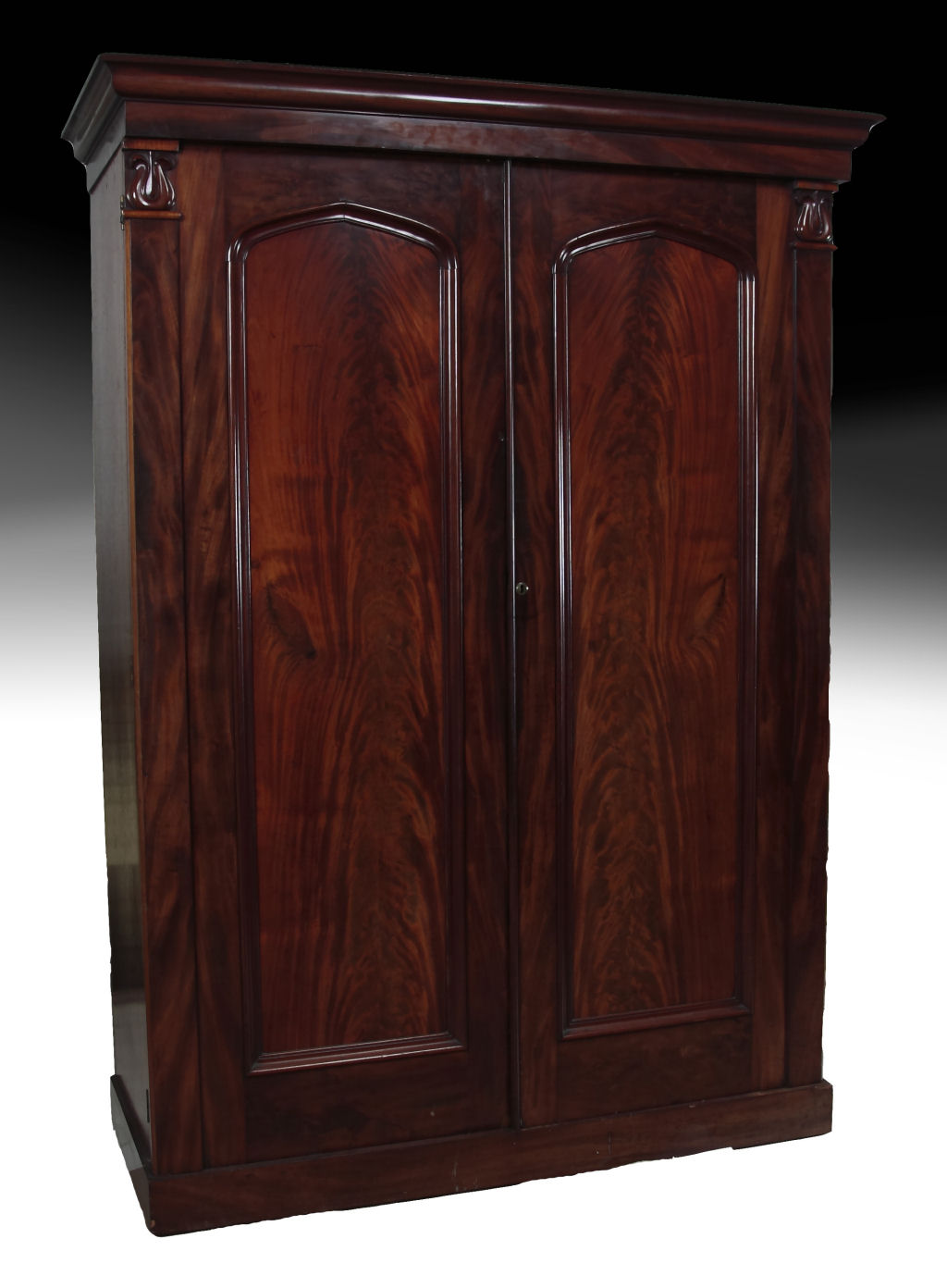 the projected moulded cornice over two panelled doors enclosing drawers and hanging space, flanked by acanthus topped columns, raised on plinth base