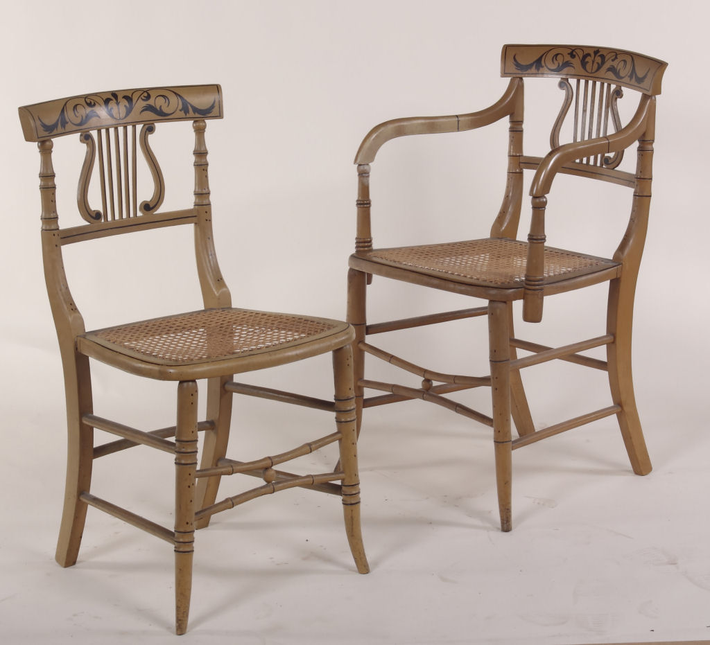 each with floral painted tablet top-rail over lyre splats, caned seat, raised on turned legs united by stretchers (5)