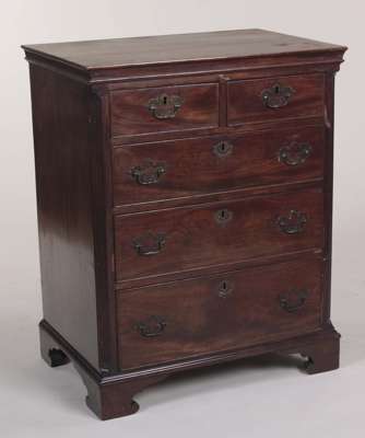 the moulded top above two short and three graduated long cockbeaded drawers flanked by fluted canted corners, raised on bracket feet