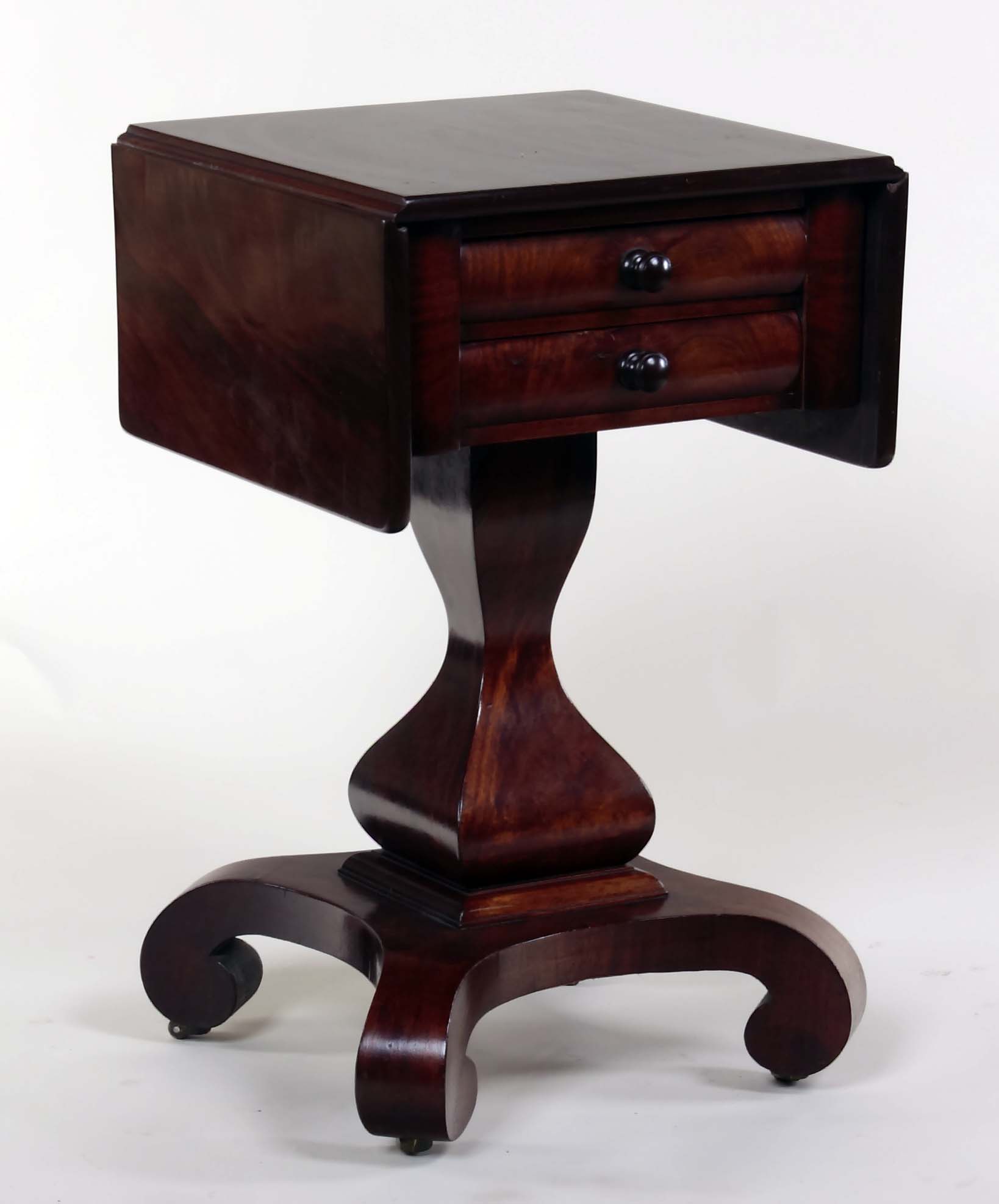 the rectangular drop flap top over two convex frieze drawers raised on a square bulbous vase shaped support, quadriform base with scroll feet terminating in brass castors