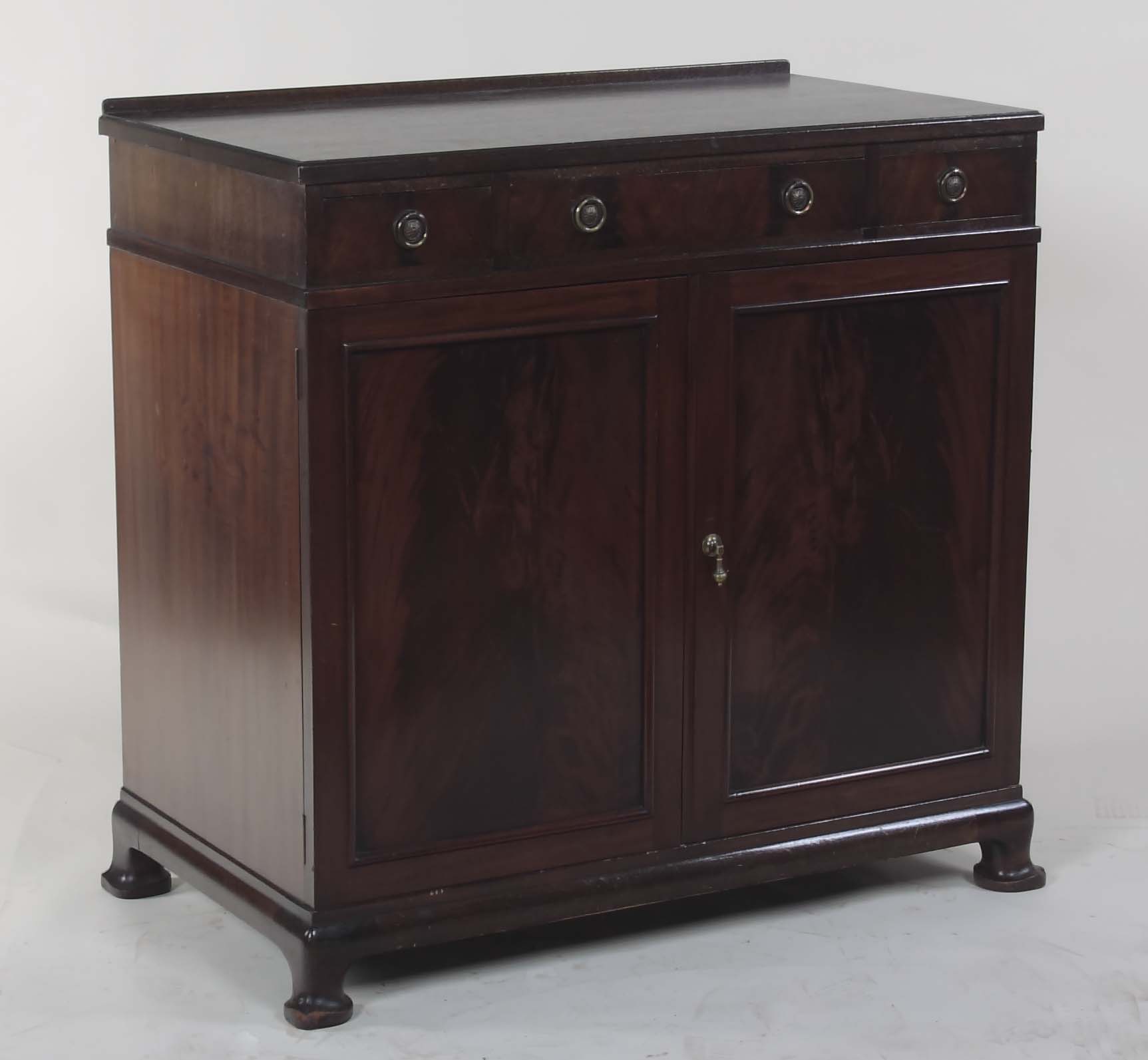 the moulded rectangular top over one long frieze drawer flanked by two short drawers above two panelled doors enclosing shelves and maker's label, raised on pointed pad feet