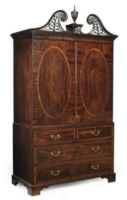 the carved and fretted swan-neck pediment centred by an urn, dentil cornice, two doors to the upper section with kingwood banded ovals, fitted with two short and two long drawers below, bracket feet (lacking slides)