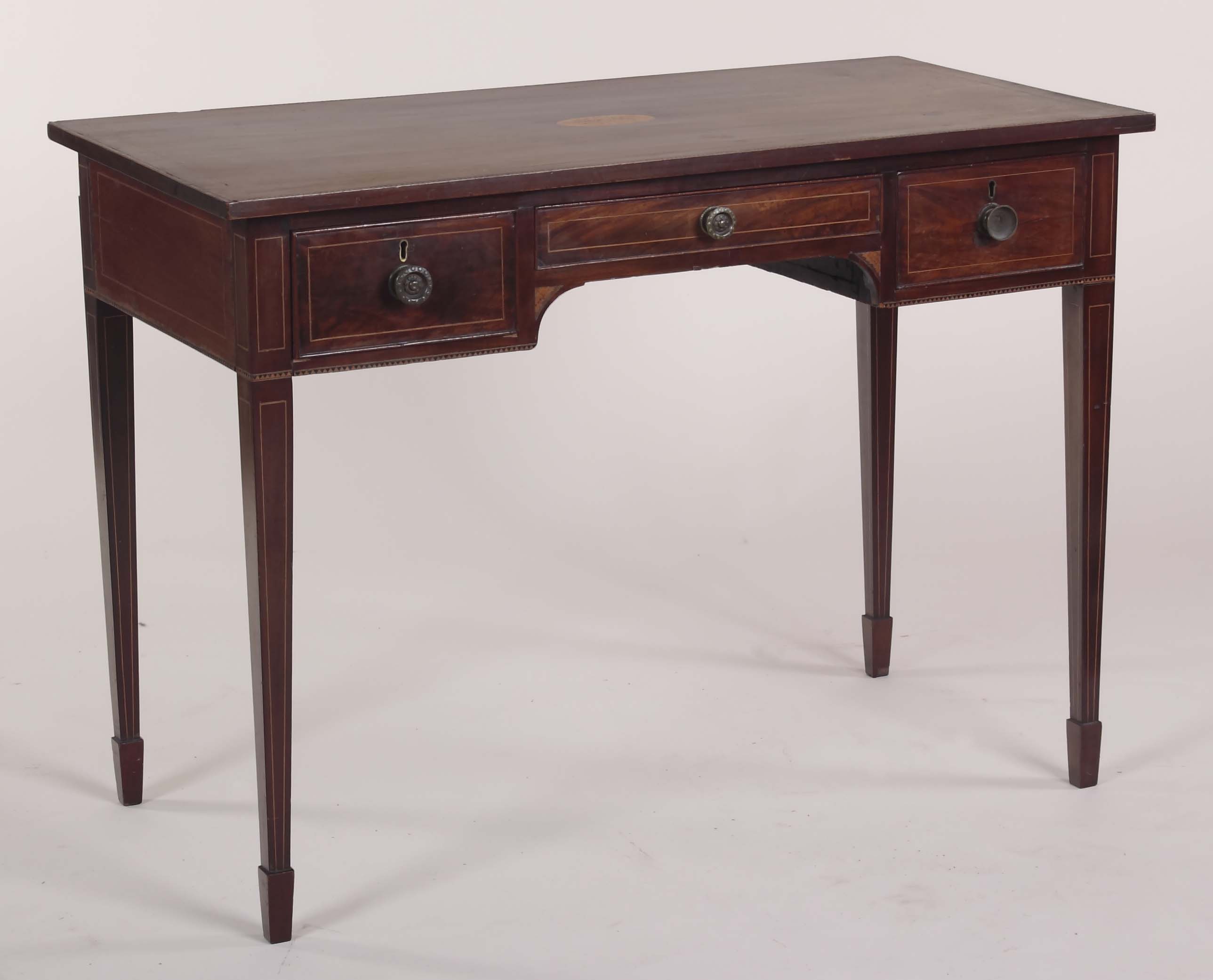the boxwood strung and lozenge inlay rectangular top over a frieze drawer flanked by deeper drawers raised on square tapering legs, terminating in spade feet ALTERATION: 75cm high not 105cm