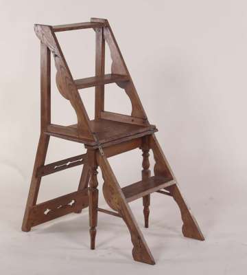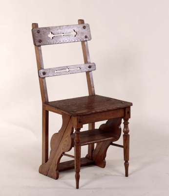 the pierced top-rail over horizontal splat, plank seat raised on tapering baluster turned octagonal legs