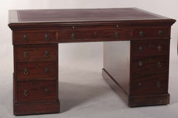 the moulded rectangular top with red skiver over three frieze drawers and writing slide, three pedestal drawers, the plinth base raised on castors
