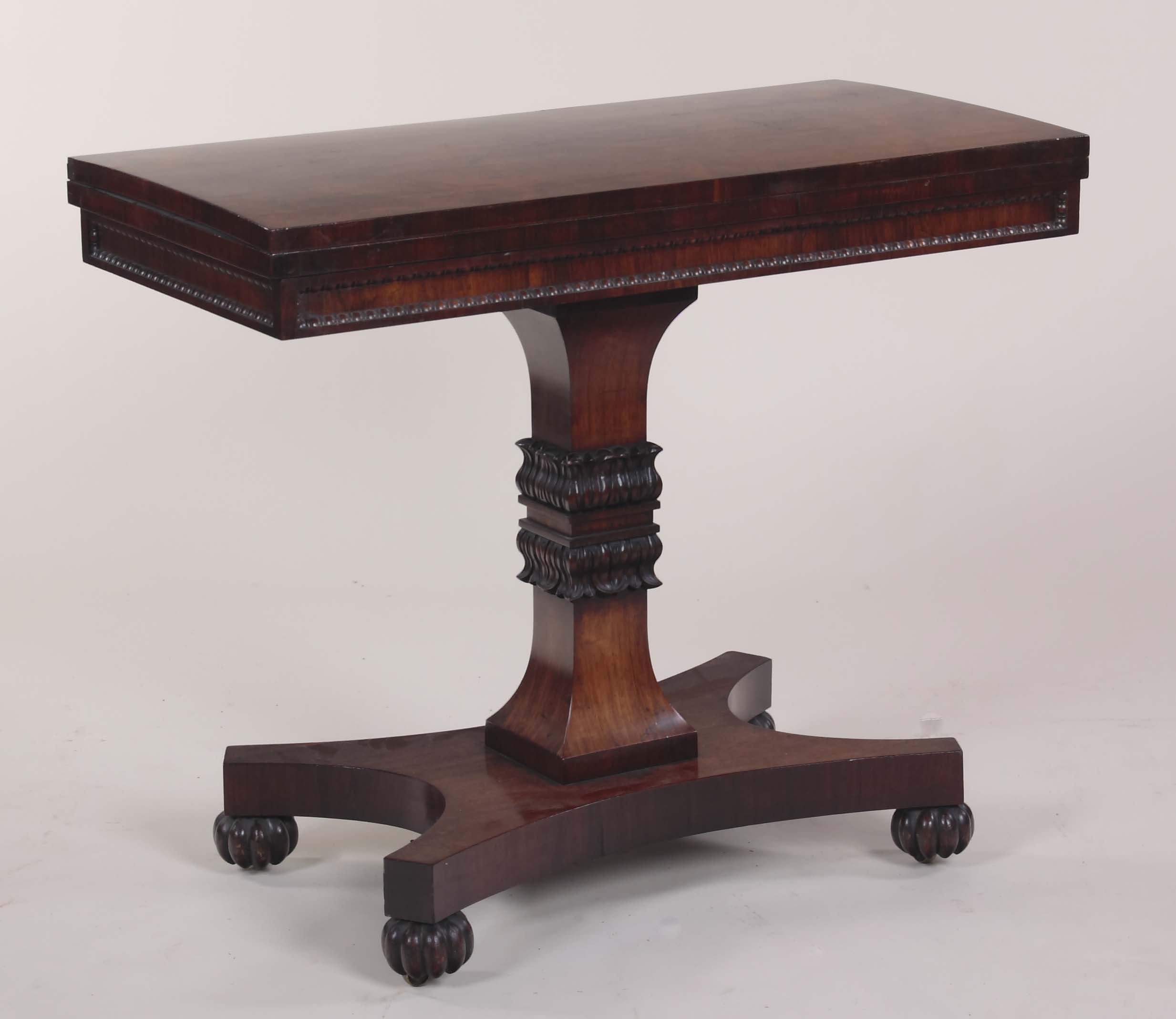 the rectangular swivel top above a sunken field quadrant beaded frieze and square inswept pedestal carved with stiff leaf decoration on quadrapartite platform base with reeded bun feet