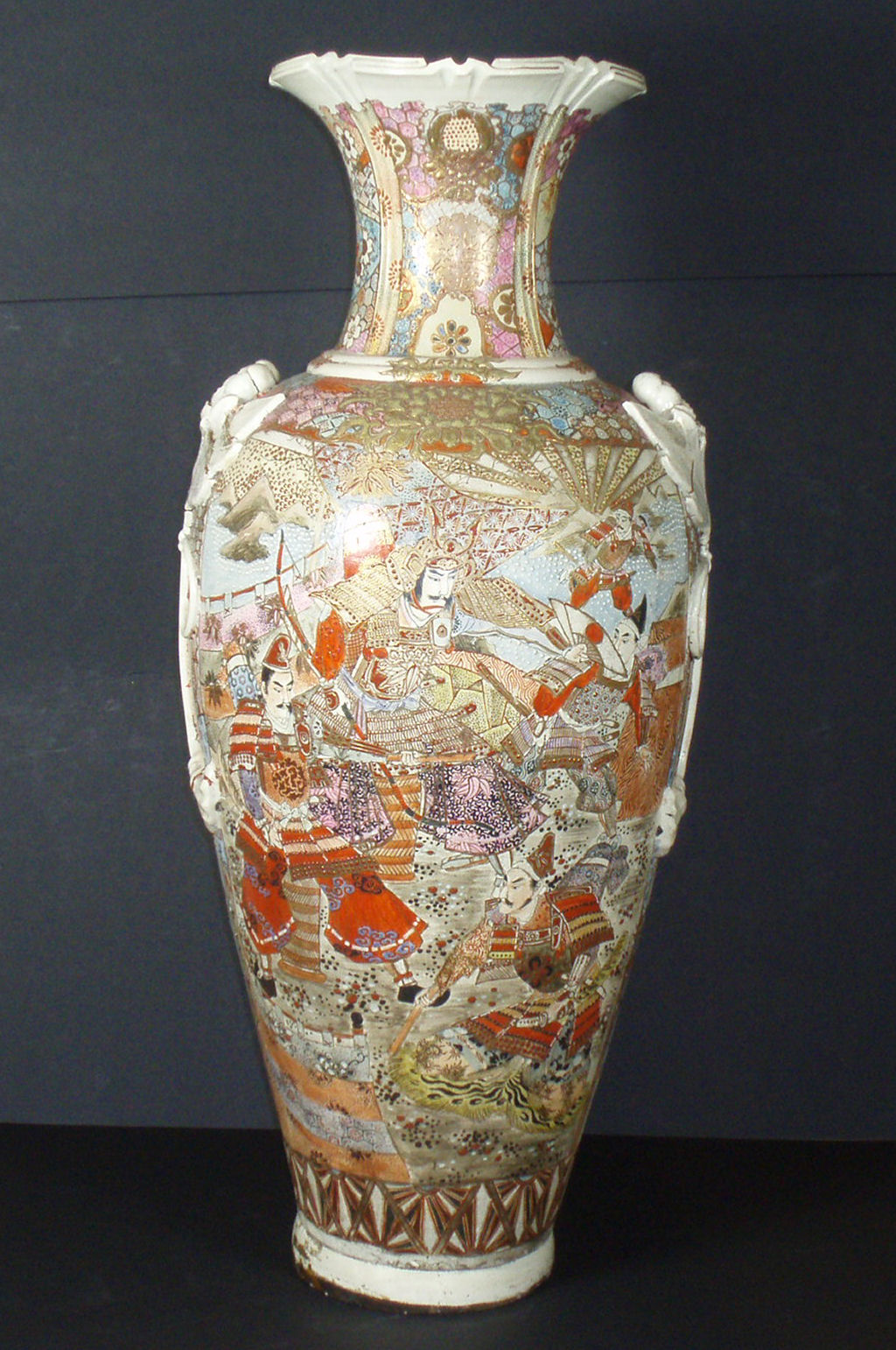 of baluster form with flower moulded handles, decorated with samurai warriors and flowers on a multi-diaper ground, character marks