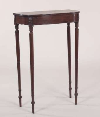 the reeded demi-lune top over plain frieze with carved rosettes raised on ring turned legs