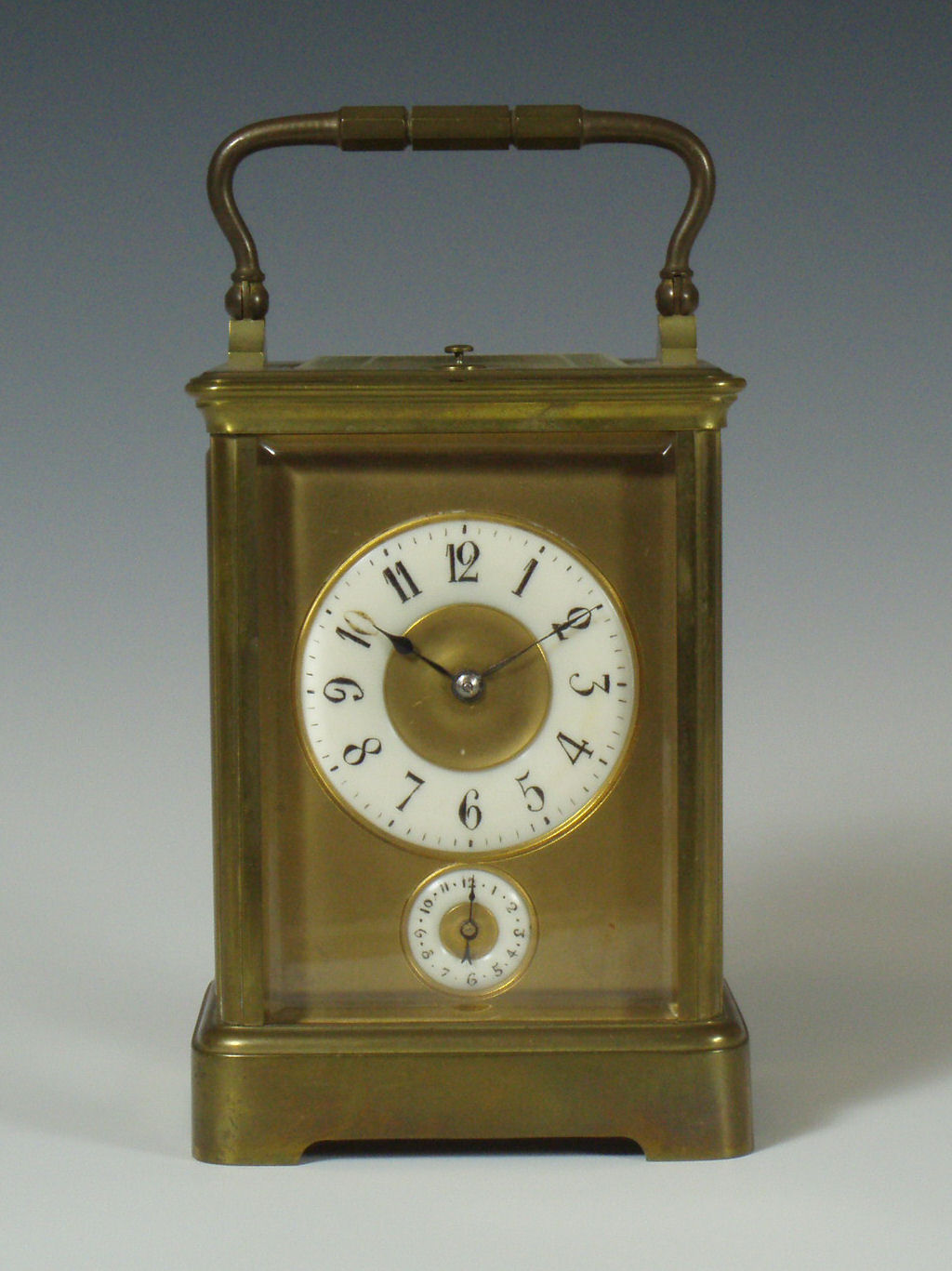 of rectangular form with handle, with a white enamel dial and subsidiary dial with arabic chapters, lever escapement striking on a coiled gong