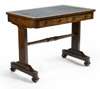 the rounded rectangular top with tooled green leather skiver above two drawers fitted with Mordan & Co. locks and stamped GILLOW & CO, on square section trestle base decorated with scrolled corner frets and united by a pole stretcher, on turned bun feet with recessed castors
