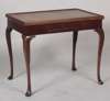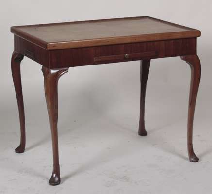the moulded rectangular top lifting to reveal a backgammon board over a chequered slide and two smaller opposing slides, raised on cabriole legs terminating in shaped pad feet