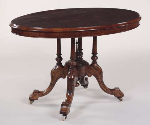 the moulded oval top raised on turned columns with carved downswept quadruped legs and ceramic castors