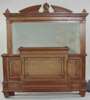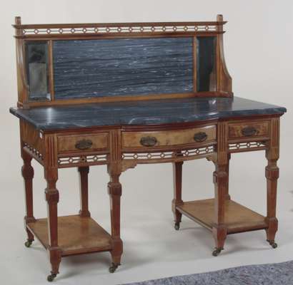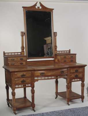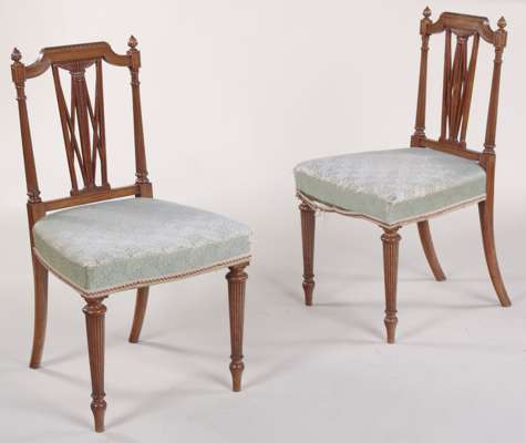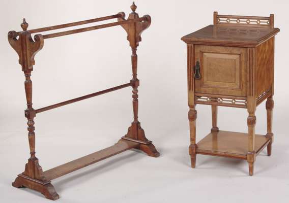 comprising: a bed with tall head board with arched broken pediment and dentil cornice over a cushioned back with stepped foot board of similar design, 163cm wide, 180cm high, 225cm long; a dressing table with broken pediment framed rectangular mirror flanked by two short drawers over moulded bowfront top, the central long drawer flanked by two short drawers and fluted columns, raised on square tapering legs and united by shelves, terminating in ceramic castors,145cm wide, 194cm high, 65cm deep; a wash stand with grey marble splash board over a moulded bowfront top with three frieze drawers raised on square tapering legs united by shelves with ceramic castors, 122cm wide,116cm high, 66cm deep; a pot cupboard with pierced gallery over a moulded top panelled door flanked by fluted columns raised on tapering square legs united by a shelf, 43cm wide, 84cm high, 43cm deep; a pair of side chairs with stepped top-rail over vertical splats cushioned seat tapering reeded legs; towel rail with urn finials, baluster turned supports, raised on splayed bracket feet, stamped 'John Taylor & Son Edinburgh U9495', 83cm wide, 92cm high, 25cm deep (7)