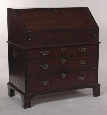 the moulded fall-flap enclosing a fitted interior, over three graduated long drawers, raised on bracket feet
