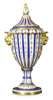 the cover with acanthus finial, the vase of urn shape with shell and cherub head handles, decorated in blue and gilt, blue painted mark