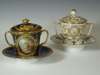 decorated with landscape panels on a cobalt blue ground with gilt highlights, painted mark to base, cup 11.5cm high, saucer 16.5cm diameter; and a similar cabinet cup, cover and saucer with panels of birds on a white ground with gilt highlights, painted mark to base, cup 12.5cm high, saucer 17.5cm diameter (2)