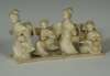 depicting four bejins in a row, each carrying a basket and a fan, signed