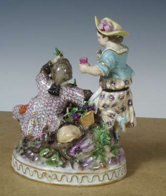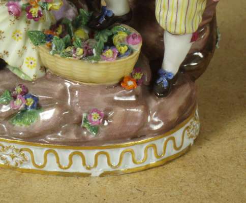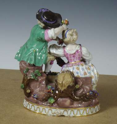 each modelled as a couple allegorical of summer and autumn, blue crossed marks (2) PLEASE NOTE: THIS LOT HAS VAT ON THE HAMMER